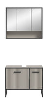 Compact and functional, this two-piece bathroom vanity unit in cashmere imitation brings style to small bathrooms. Equipped with a washbasin base cabinet and a practical mirror cabinet, this set offers the perfect solution for limited spaces. The easy-care surface ensures your bathroom always looks fresh and appealing, while the modern grooved look adds an elegant touch to your decor.