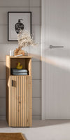 The slim and stylish bathroom cabinet in Brown imitation offers practicality and elegance. This cabinet features a high-quality, easy-care front with a milled panel look, perfect for adding warmth to any bathroom. Equipped with a reversible door hinge, height-adjustable shelf, one door, two closed compartments, and an open compartment, it provides ample storage. The cabinet's dimensions and customizable options make it an optimal solution for versatile bathroom design.
