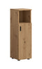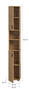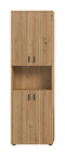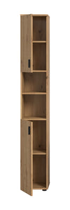 This tall bathroom cabinet in Brown imitation combines modern design with practical organization. It features two doors, two height-adjustable shelves, four closed and two open compartments, and three fixed structural shelves. With a reversible door hinge, it provides flexible placement options while offering ample storage space. The high-quality, easy-care front with a milled panel look brings a warm, natural feel to your bathroom.