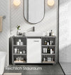 The Rootz sink unit, designed in a stylish grey white finish, adds a touch of elegance to any bathroom decor. Made from durable wooden chipboard and MDF, it promises longevity and resilience. With generous dimensions offering ample storage under your sink, this unit combines functionality with aesthetic appeal. Its robust construction supports a load capacity of up to 75 kg, ensuring reliability and sturdiness.
