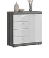 Upgrade your living space with the stylish Scout chest of drawers featuring a white high-gloss front and smoke silver imitation body. Measuring approximately 80 x 85 x 37 cm, this piece comes with 1 door, 4 drawers, and 2 shelves for ample storage space. The full extension mechanism allows complete drawer access.