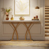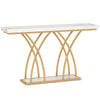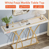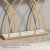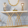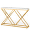 Sporting a modern minimalist aesthetic, the Rootz console table features a stunning geometric gold metal frame that adds glamour to your decor. The white faux marble top is luxurious and easy-to-clean, offering a smooth surface for quick maintenance. Ideal for various spaces, this versatile table is stable and sturdy, with enhanced stability and rubber stoppers to prevent floor damage.