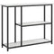 This modern console table. The black metal frame and the tempered glass surface form a minimalist and practical furniture highlight