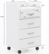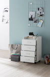 Our Modern Roll Container is a sleek and versatile storage solution with a timeless design, featuring four drawers, a shelf, and practical rollers for easy mobility. The white roll container with black accents is made of durable chipboard and is individually applicable to any space.