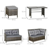 NOBLE POLY RAT SOFA SET: Comfortable 6-piece seating group for indoor and outdoor use. Your set includes 1 table, 2 stools, 1 corner sofa, 2 double sofas, and seat and back cushions.