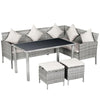 FIVE-PIECE SEATING GROUP: The set includes two double sofas that can be combined to form an L-shape, two ottomans and a dining table.