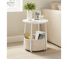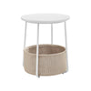 Elevate your living space with The Rootz Round Side Table featuring a convenient fabric basket. This stylish and functional piece is perfect for storing remote controls, magazines, and more.
