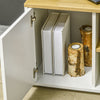 This beautiful Scandinavian TV bench in a two-tone look in light wood and white adds modernity and sophistication to your home. With ample storage space, including three open shelves and two cabinets, it is perfect for organizing your entertainment essentials.