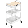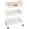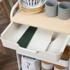 This compact kitchen cart is perfect for small spaces, offering ample storage with 2 shelves, drawer, and shelf. Made of white steel and light brown wood look, it's a stylish addition to any room.