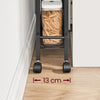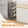 The Rootz rolling car features 5 levels of storage in a vintage brown-black color, making it both stylish and functional. Made from durable wooden chipboard and sturdy steel, this narrow kitchen car is perfect for organizing and holding your kitchen essentials, maximizing space in any niche or area.