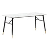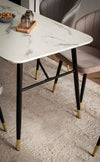 Elevate your dining room with The Rootz small dining table featuring a modern white look design. The rectangular table top in harmonious white marble look pairs elegantly with black and gold legs.
