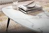 Enhance your living room with this modern sofa table featuring a marble look top and stylish color combination.