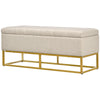 This elegant upholstered bench offers sophistication and functionality with a gold metal base, padded seat, and ample storage space. Ideal for any interior.