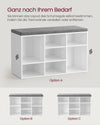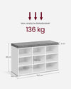 A versatile shoe bench with cushions and 9 compartments in white- grey color. Made of chipboard and foam, measuring 30.3 x 78.5 x 48 cm (D x W x H), weighing 14 kg. Max static load capacity of 136 kg.