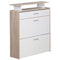 A modern and space-saving solution for organizing your footwear collection. With its four unfolding shelves and practical handles, this white shoe cupboard with a Sonoma oak front combines functionality and style, making it the perfect addition to any hallway or entryway. Its tilting trays with hinges and integrated stop ensure easy access to your shoes, while the sturdy chipboard construction guarantees durability.