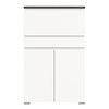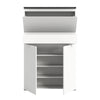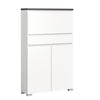 The high-quality Shoelove system furniture is modern and easy to care for. This shoe chest in white with an industrial gray top is timeless, offering shoe storage with 1 drawer, 2 doors, 1 flap, and 3 shelves.