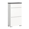Timeless design: The modern and easy-to-care-for Shoelove system furniture features a timeless design in white and industrial gray, ensuring long-lasting joy and style in your home.Shoe storage with system: This shoe chest provides convenient storage space with 1 drawer and 1 flap (2 compartments), keeping your shoes, hats, and scarves organized and easily accessible in your hallway or other areas.
