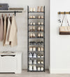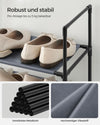 This narrow shoe rack features sturdy shelves made of gray non-woven fabric, ideal for organizing your footwear collection neatly.