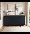 This stylish sideboard is the ideal complement to any modern living room, dining room, or bedroom. Crafted from black painted oak veneer and MDF board, and supported by slim steel legs, it offers both functionality and a sleek design.