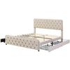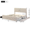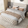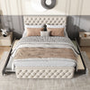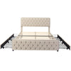 This elegant beige upholstered bed combines functionality and style, offering a comfortable sleeping environment with a unique studded design and ample storage space.