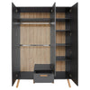 Introducing our modern, easy-care wardrobe designed especially for the chic baby room. Crafted in a grey melamine finish, this furniture piece is both stylish and functional. With three doors, a drawer, multiple shelves, and two clothes rails, this wardrobe promises ample storage while elevating the aesthetic of your baby's space.