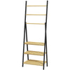 Enhance your bathroom's functionality with the Rootz Foldable Towel Holder. Crafted from durable bamboo and featuring a robust black steel frame, it provides ample space with three hanging rods and a three-stage shelf. This elegant organizer is easy to assemble, foldable for convenient storage, and designed for quick drying, making it a perfect addition to any bathroom.