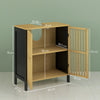 Optimize your bathroom space with The Rootz sink unit, featuring a beautiful blend of a black frame and solid bamboo doors. This durable cabinet is perfect for stowing away shower and beauty products, while the height-adjustable shelves and compact design make it suitable for any bathroom size.