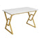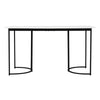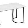 This modern dining table measuring 140 x 80 cm features an elegant marble pattern table top and a sturdy metal frame, suitable for dining, living room, or office use. Its adjustable feet ensure stability, while the geometric table legs add aesthetic appeal, combining style and functionality. Made of high-quality MDF and metal, this table is durable with a load capacity of up to 75 kg.