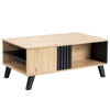 This stylish coffee table combines warm wood look with elegant black accents, offering the perfect mix of functionality and design. With dimensions of 100L x 60W x 53H cm and multiple storage options, including a large compartment and two smaller compartments, it keeps home accessories handy and tidy. The robust chipboard and MDF construction ensures durability, while the black plastic legs give the table a modern touch. Ideal for any living room, it provides a timeless elegance.