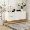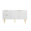 This elegant sideboard measuring 135L x 40W x 75H cm impresses with its unique surface pattern and luxurious gold-plated handles and feet. Offering two doors and two drawers for ample storage space while maintaining a tidy home look. The adjustable shelves inside the doors provide flexibility. Made from high-quality chipboard, this sideboard is durable, easy to care for, and an eye-catcher.