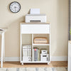 The Rootz Printer Table is a versatile piece of furniture perfect for storing your essential items. It features a drawer and three shelves to organize books, papers, pens, and more. The top shelf, made from rubber wood, provides ample space for printers, photos, and decorative items. This table is designed for easy mobility with two rollers, including stoppers for stability on any surface.