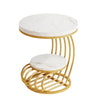 This Stunning Side Table features a white faux marble top and gold metal frame, adding elegance and creativity to your decor. It offers two-tier storage for ample display and organizing space. Measuring 50 cm x 64 cm , it is compact and versatile, suitable as an end table or nightstand. Crafted with durable particleboard and metal frame, it ensures resilience and stability.
