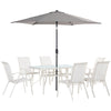8 PIECE SEATING SET: The set consists of a rectangular table, a parasol and six matching mesh chairs for sipping tea, playing games, entertaining and more.