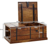 Introducing our modern rectangular coffee table with an integrated wine rack, featuring a dark brown body, elegant grain, and convenient storage compartments for wine and essentials, handcrafted with solid sheesham wood and lacquered metal accents.