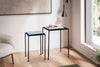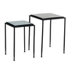 Elevate your living space with this side table set featuring clear aqua blue and black table tops on sturdy metal frames.