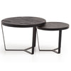 Introducing the Rootz round coffee tables, a perfect blend of modern design and practicality. This set of two tables, each in a different size, features a natural wood grain on the large table top and an elegant stone look on the small table top. Handmade for a unique touch, these tables can be used as a set or individually, offering versatility for your living space.