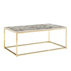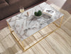 Verleihen Sie Ihrem Wohnraum einen Hauch von Eleganz mit unserem modernen rechteckigen Couchtisch mit anmutiger Hochglanzoptik aus weißem Marmor und glänzenden goldenen Beinen. Er sorgt für eine sichere und stilvolle Ergänzung für jeden Raum und schützt gleichzeitig Ihre Böden durch die integrierten Beinkappen aus Kunststoff.