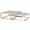 Ein Set aus zwei modernen und eleganten Wohnzimmertischen mit atemberaubenden Tischplatten in Marmoroptik, stabilen Metallrahmen mit elegantem Goldfinish, geräumigen Regalen für praktische Aufbewahrung und der Möglichkeit, sie als ineinander gestecktes Set oder einzeln zu verwenden, was sowohl Funktionalität als auch Funktionalität bietet Stil für jeden Wohnraum.