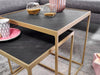 Quadratische industrielle Beistelltische, ein faszinierendes Set mit anthrazitfarbenen Steinoberflächen mit ungewöhnlicher Struktur, ergänzt durch dunkelgoldene Rahmen für eine elegante Note. Diese mit größter Sorgfalt handgefertigten einzigartigen Tische können einzeln oder als Set verwendet werden, um Ihren Wohnraum mit ihrem vielseitigen Industriedesign zu bereichern.