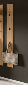 The 160x13x6 cm wardrobe panel in Brown is perfect for organizing your coats and accessories. Equipped with three sturdy black metal hooks, this panel offers both functionality and style. The use of FSC®-certified chipboard ensures sustainability, while its easy-care surface allows for effortless maintenance. Expandable with other series items, it provides a versatile and customizable solution for any hallway.