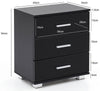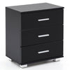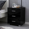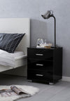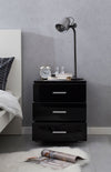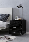 Die schlanke und elegante Nachtkonsole, ein moderner Nachttisch mit drei geräumigen Schubladen mit silbernen Griffen, einem großen Regal für vielseitige Aufbewahrung und einer schwarzen Hochglanzoberfläche, die mühelos zu jedem Einrichtungsstil passt. Mit seiner langlebigen, melaminharzbeschichteten Spanplattenkonstruktion und schützenden Kunststoffkappen an den Füßen ist diese Nachtkonsole eine praktische und stilvolle Ergänzung für jedes Schlafzimmer