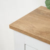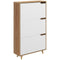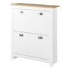 This contemporary two-tone shoe cabinet in light oak and white with silver shell handles is ideal for your entryway or dressing room.