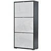 This contemporary shoe cabinet features 3 folding doors with double compartments, perfect for organizing and storing your shoes in style. Made from MDF with a black and white finish, this cabinet adds elegance to your entryway or dressing room.
