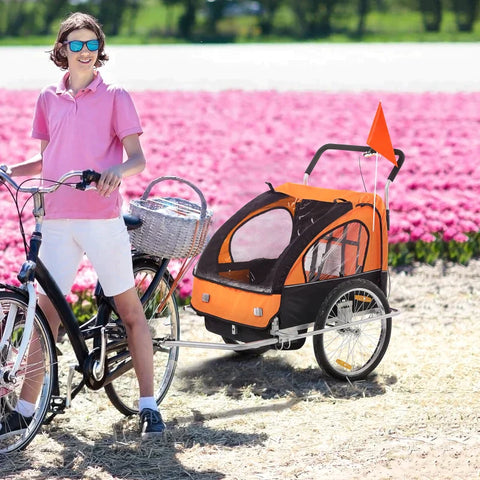 Rootz Kinderanhänger – Kinderfahrradanhänger – für 2 Kinder – inklusive Reflektoren und Fahne – Regenschutz atmungsaktiv – Orange/Schwarz – 142 x 85 x 105 cm