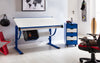 Verstellbarer Kinderschreibtisch, entworfen in einer kühlen Blau-Weiß-Ästhetik, perfekt für Jungen. Er bietet Höhen- und Neigungsverstellungen für Kinder und Jugendliche im Alter von 6 bis 15 Jahren und fördert eine komfortable und ergonomische Lernumgebung. Dieser Schreibtisch verfügt über ein stabiles C-Fuß-Gestell aus lackiertem Metall für Stabilität, eine melaminharzbeschichtete MDF-Tischplatte, integrierte Lineale, ein praktisches Ablagefach, einen Schulranzenhalter und eine geräumige, neigbare Oberfläche, die uneingeschränktes Lernen, Basteln und Malen fördert.