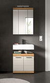 This compact and elegant bathroom combination set in Brown imitation (60 x 191 x 34 cm) is perfect for maximizing small bathroom spaces without sacrificing style. It includes a washbasin base cabinet, a mirror cabinet, and an integrated bathroom light. Made with easy-care MDF with milled grooves, it ensures durability and adds a touch of modernity. Perfect for those who value functionality and aesthetics.