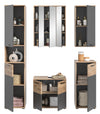 The high-quality MASON bathroom furniture set is a modern, timeless addition to your bathroom. The design showcases a gray front with a body made of Nox Oak replica, ensuring a stylish and easy-to-maintain look.