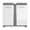 Bathroom furniture with a system: The Rootz Blake Washbasin Cabinet features a white high-gloss MDF construction with a deep-drawn front combined with a smoke silver replica body. It is designed with 2 doors, 1 shelf, and dimensions of 60 x 57 x 34 cm.