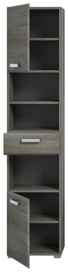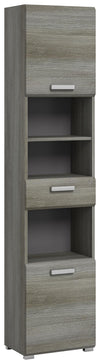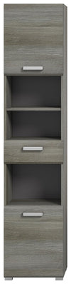 Upgrade your bathroom with The Rootz Silver Tall Cabinet designed for style and functionality. This piece features 2 doors, 1 drawer, 3 open compartments, and 3 shelves for ample storage.