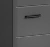 The washbasin cabinet in gray imitation with gray high-gloss features a modern design, adding elegance to any bathroom.